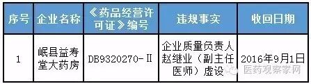 9月2日,甘肃省定西药监局发布收回药品GSP认证证书公告,岷县益寿堂大药房违反《药品经营质量管理规范》的规定,依据《药品医疗器械飞行检查办法》第二十五条,决定收回该企业《药品GSP认证证书》。