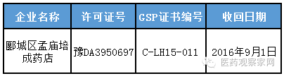9月2日,河南省漯河市药监局发布收回GSP认证证书公告,郾城区孟庙培成药店严重违反《药品经营质量管理规范》(总局令13号)的有关规定,依据《药品医疗器械飞行检查管理办法》(总局令14号)之规定,决定收回其《药品经营质量管理规范认证证书》。