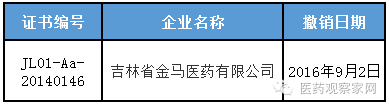 9月2日,吉林省药监局发布撤销GSP认证证书公告,吉林省金马医药有限公司严重违反《药match品经营质量管理规范》规定,依据《药品经营质量管理规范认证管理办法》第四十五条及国家食品药品监督管理总局《关于严格执行<药品经营质量管理规范>加强药品批发企业监督检查工作的通知》(食药监药化监〔2015〕85号)规定,依法撤销其《药品经营质量管理规范认证证书》。