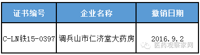 9月2日,辽宁省铁岭市药监局发布撤销GSP认证证书公告,调兵山市仁济堂大药房严重违反《药品经营质量管理规范》规定,根据《药品经营质量管理规范认证管理办法》第四match十五条规定,依法撤销其《药品经营质量管理规范认证证书》。