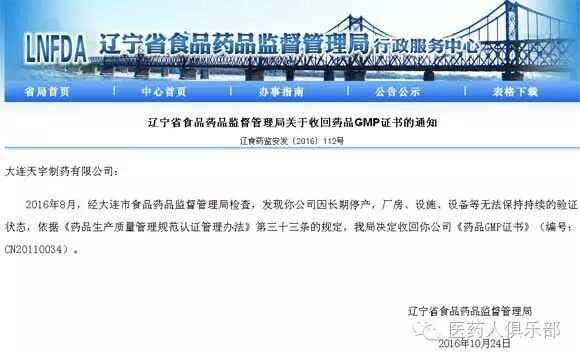 2016年8月,经大连市食品药品监督管理局检查,发现大连天宇制药有限公司因长期停产,厂房、设施、设备等无法保持持续的验证状态。依据《药品生产质量管理规范认证管理办法》第三十三条的规定,辽宁省食品药品监督管理局决定收回该公司《药品GMP证书》(编号:CN20110034)。