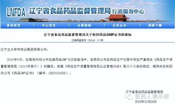 2016年9月,辽宁省食品药品监督管理局对辽宁正大祥和药业集团有限公司实施药品GMP飞行检查当中,发现该公司在药品生产过程中存在严重违反《药品生产质量管理规范(2010年修订)》的情况。依据《药品生产质量管理规范认证管理办法》第三十三条的规定,辽宁省食品药品监督管理局决定收回该公司《药品GMP证书》(编号:LN20150035)。