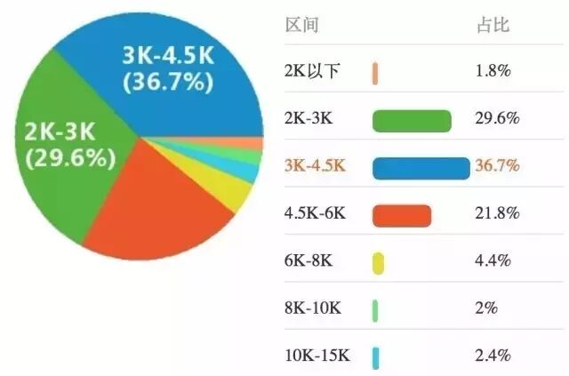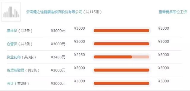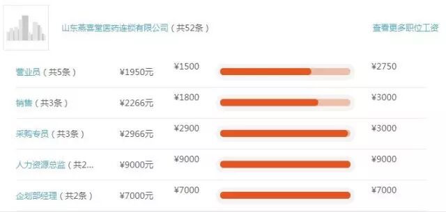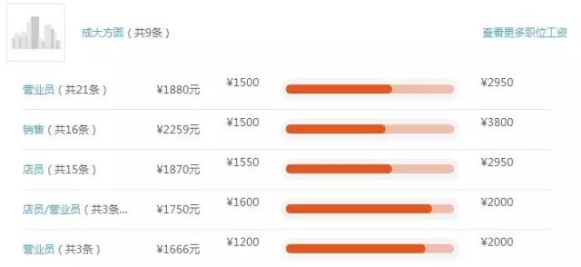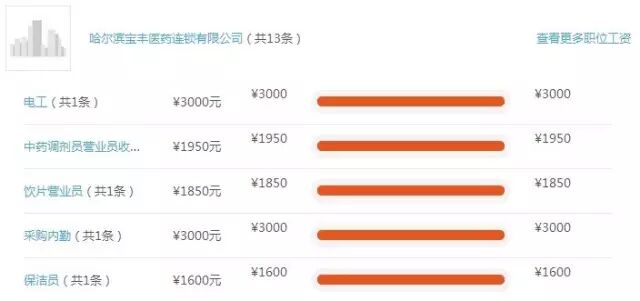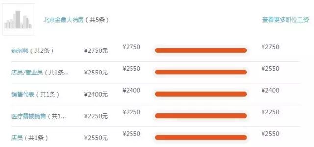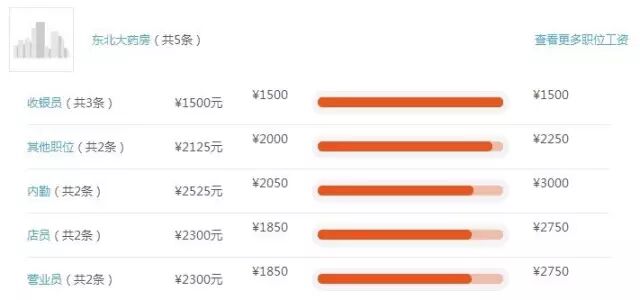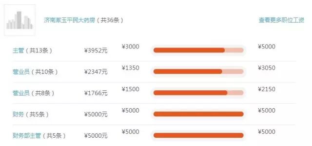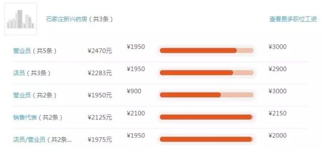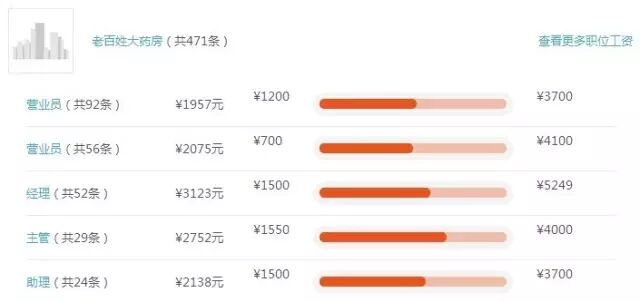 在职友集的统计中,药店店员的工资区间如下图所示,2000元以下的占31.8%,2000~3000元的占29.6%,3000-4500元的占36.7%,当然也不乏更逆天的4500-6000元区间,这个比例也占到了21.8%,6000以上的还是少数了。