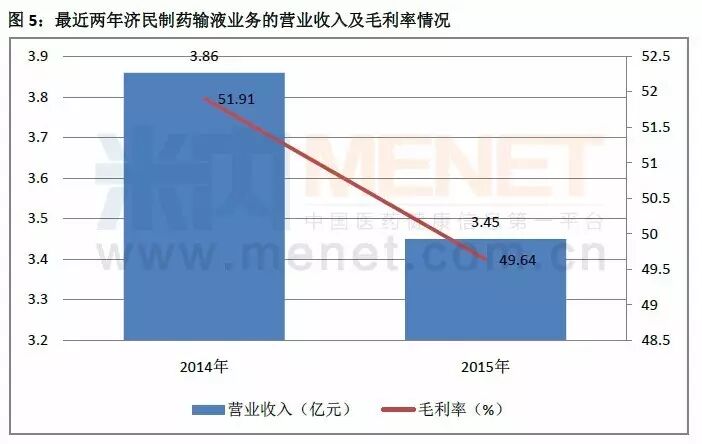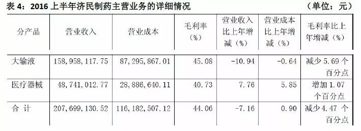 济民制药大输液业务的毛利率这两年都在50%附近徘徊,2016上半年下降至45.08%。该公司表示,在“限输、限抗、门诊限挂”的政策环境下,输液市场容量逐步萎缩。医保控费、招标政策变革使得输液价格继续下行,公司输液业务发展面临较大压力。