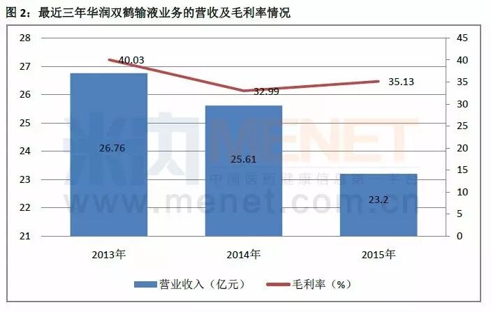 最近三年,华润双鹤的营业收入以及净利润都出现了下滑的现象,2014年两项降幅一度超过了37%,为历年之最。其中,输液业务的营收也是直线下滑,毛利率也从2013年的40%一路下滑。