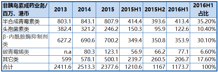 公司非胰岛素成药业务主要有五大类:包括以口服制剂为主的半合成青霉素类、以注射剂为主的头孢菌素类抗生素、中高端抗生素β-内酰胺酶抑制剂类和碳青霉烯类抗生素,以及其他类药物。抗生素类占化药收入比重超过80%,2016年上半年各大类抗生素收入占化药制剂收入比率见表1。