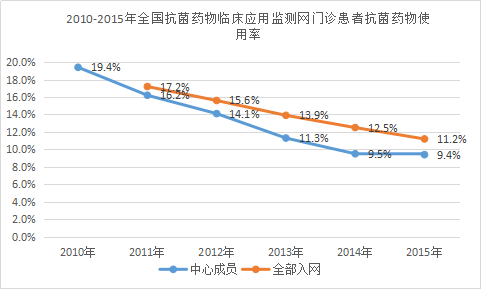 图2、2010-2105年全国抗菌药物临床应用监测网门诊患者抗菌药物使用率