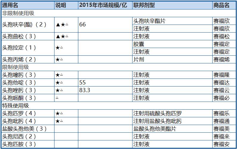 资料来源: 2011年卫生部《抗生素分级管理目录(征求意见稿)》,各个省份有所差异。注:(n)表示该品种为n代头孢抗生素