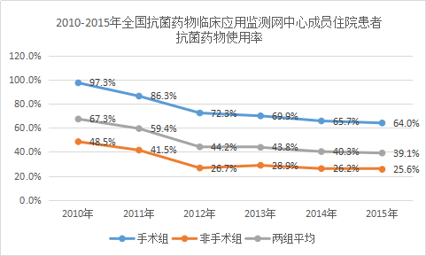 图1、2010-2105年全国抗菌药物临床应用监测网住院患者抗菌药物使用率