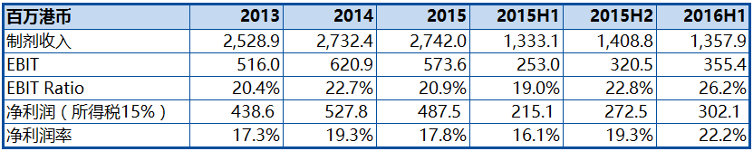 公司近年来制剂收入维持在27亿港币左右(包括胰岛素),不算利息支出净利润率在18%左右(考虑到目前胰岛素盈利能力较低,化学制剂的净利润率更高),净利润2015年上半年以来净利润率逐渐提高,2016年上半年达到22.2%(有小部分半合成青霉素原料药价格下跌因素)。可以预期随着收入小幅增长,盈利能力高品类占比提升,未来化药制剂板块的不算利息支出的净利润率将会提升,预计会维持在20%左右。