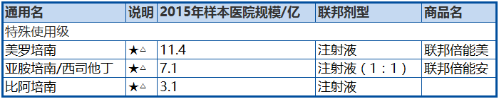 碳青霉烯类:是广谱高端抗生素,细菌耐药率低,作为抗菌药物分类管理中的特殊使用级品种,需要副主任级别以上医生才能开处方, 被禁止在门诊使用,主要用于重度感染和ICU病房病人。公司在该品类有三个品种,包括亚胺培南、美罗培南和比阿培南,这三个品种2015年样本医院规模分别达到11.4、7.1和3.1亿人民币,同比分别增长17.4%,18.6%和40.7%,产品内生增长动力很强。