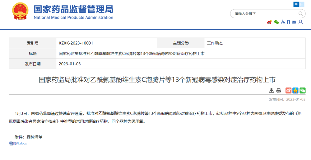 1月3日,国家药监局通过快速审评通道,批准对乙酰氨基酚维生素C泡腾片等13个新冠病毒感染对症治疗药物上市,其中,海南两家企业生产的药品入选。获批品种中9个品种为国家卫生健康委发布的《新冠病毒感染者居家治疗指南》中推荐的常用对症治疗药物,4个品种为医用氧。