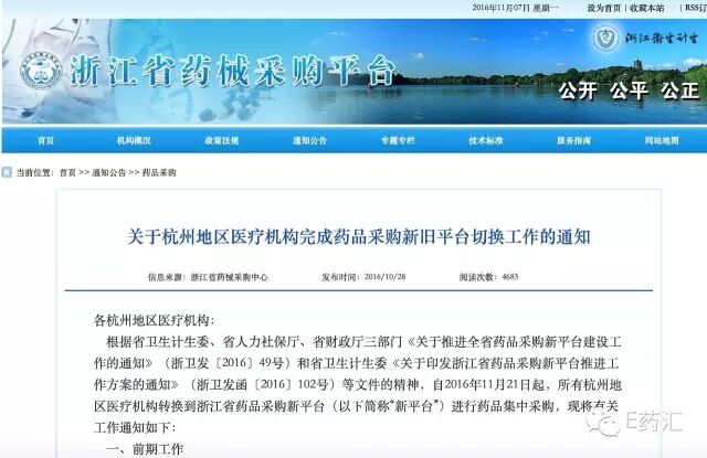 10月17日,浙江省卫生计生委在上发布《关于印发浙江省药品采购新平台推进工作方案的通知》,发布了浙江省药品采购新平台推进的具体时间表——