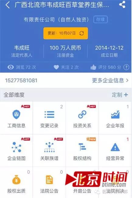 查询发现,生产鼻炎康复膏的广西北流韦成旺百草堂公司由韦成旺在2014年12月成立,注册资金100万。企业的经营范围为“预包装食品简散装食品、保健食品、酒类销售、养生保健技术研究、开发、信息咨询服务”。