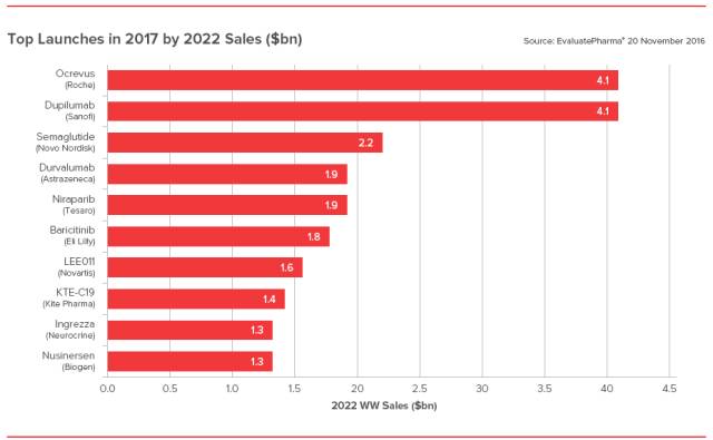 重磅新药是制药公司未来增长的希望。2017年上市新药中最值得期待的是Roche的多发性硬化药物 Ocrevus和赛诺菲皮炎药物dupilumab。
