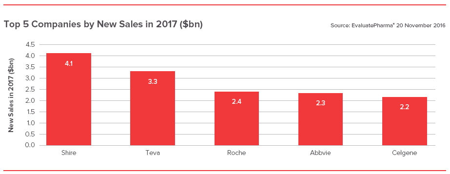 辉瑞通过大手笔收购,在2017年仍将领跑TOP10。Gilead凭借在抗感染领域的优势仍将保持在第九9位, 仿制药巨头Teva则位列第10。传统制药巨头如阿斯利康、百时美施贵宝、礼来因“专利悬崖”等因素均无缘TOP10榜单,分别位于第13、 14和15位。