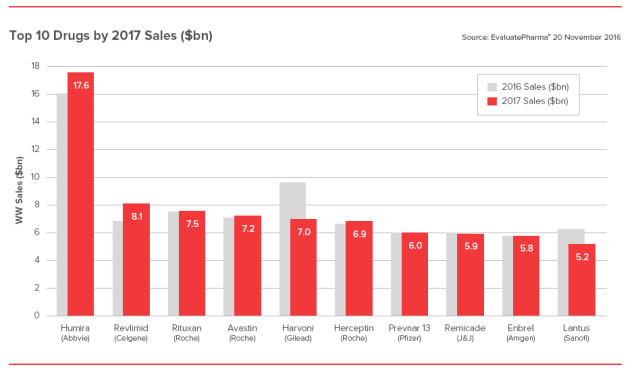 吉利德丙肝药物Harvoni是2017年TOP10药物中下降幅度最大的,Harvoni、Epclusa 2017年销售总额为117亿美元,而在2016年为149亿美元