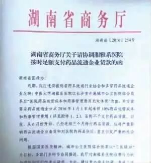 12月初,一份由省商务厅发给省医改办的函件在网络上引发关注。作为省内药品流通行业主管部门及湖南省公立医院改革工作领导小组联席成员单位,省商务厅要求,责成长沙20家大型公立医院尽快向药品配送企业兑现药款。