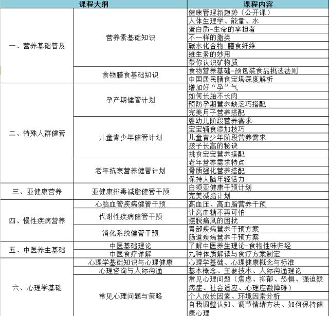 我们课程设计遵循这个原理,将健康管理定义为整体的管理,以营养、医学、运动、心理等为基础,融入环境因素对健康的干预作用,建立最佳营养和生活方式的健康管理课程。
