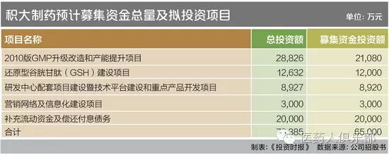 此次积大制药拟公开发行人民币普通股不超过7860万股新股,招股书中募资金额共计7.34亿元。若本次股票发行成功,按投资项目的轻重缓急,积大制药首先将实施2010版GMP升级改造和产能提升项目,其次将推动还原型谷胱甘肽(GSH)建设项目,后续还有多个项目的投入。