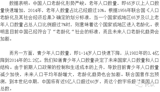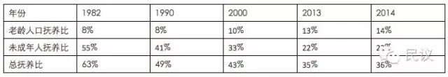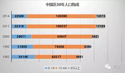 抚养比是非劳动人口与劳动人口的比例,用以表明每100名劳动年龄人口要负担多少名未成年人和老年人。比例越大,居民生活压力越大。从上图可以看到,未成年人抚养比从1982年的55%骤降到2014年的22%,这表明了中国目前未成年人数量不足,未来伴随着人口老龄化,劳动力数量将会严重不足,数量的不足也会传导到人力成本的提升。为了国家经济的可持续发展,保持健康的人口结果非常关键。因此今年10月29日,十八届五中全会也做出了“全面放开二胎”的政策决定。