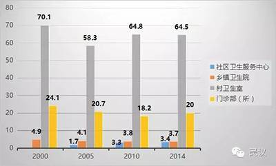 首先,依据《中国卫生和计划生育统计年鉴》,从医疗机构数量的角度看,从2000年到2014年,我国医院数量增加了9542家,而基层医疗机构数量减少了82834家。这表明在过去十余年间,从机构数量上看,基层医疗机构在居民诊疗过程中扮演了更少的角色。