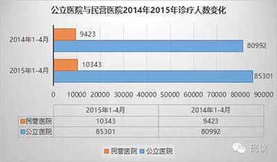 然而民营医疗数量的快速增长并不代表着其在中国医疗服务业中扮演了更大的角色。虽然民营医院数量上同比增加了12.7%。然而,实际上,根据卫计委近期公布数据显示:2015年1-4月,民营医院诊疗人数占总量的10.42%,同比增加了0.39%,而公立医院同比增加了5.4%。