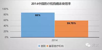 其次,从医疗机构病床使用率的角度看,基层医疗机构病床使用率相对较低。2014年医院的病床使用率达到了88%,作为对比,基层医疗机构的病床使用率只有59.7%,相当于每10张病床中,有4张处于闲置状态。这显示未来中国基层医疗机构在提高使用率上仍有较大空间。