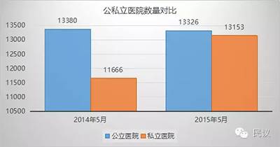 从卫计委发布的数据可以看出,截止到2015年5月,民营医院的数量“突飞猛进”,在短短的一年时间内增长了1487家。目前,从医院数量的角度看,民营医院已经和公立医院“平起平坐”。